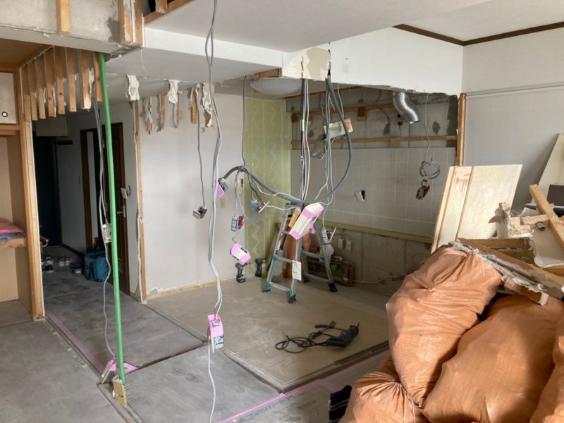 キッチン、和室を全面撤去したところ。コンセント位置の打ち合わせは施主様のご希望によりZOOMでさせていただきました。