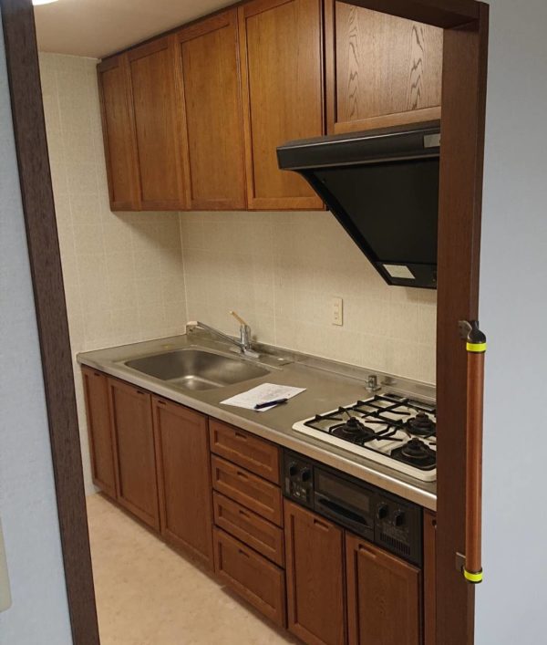 施工内容:キッチン壁付け→対面キッチンへ変更、キッチン壁撤去、廊下ドア新設、ガス・給排水管工事、電気移設工事、和室→リビングへ変更、和室と廊下の壁全面撤去