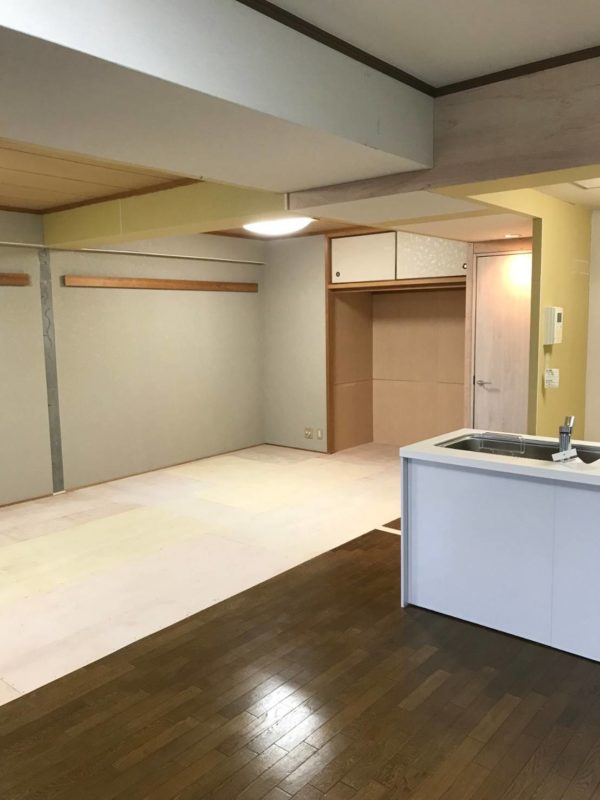 After:キッチンの中から撮影したところ。右側にあった和室もリビングと一体化になり、広いリビングになりました。右側の床材が無い箇所は施主様がDIYされるそうです